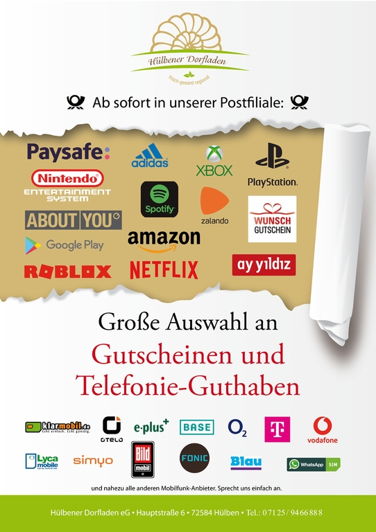 Folgende Dienstleistungen bieten wir für die Deutsche Post im Hülbener Dorladen an: