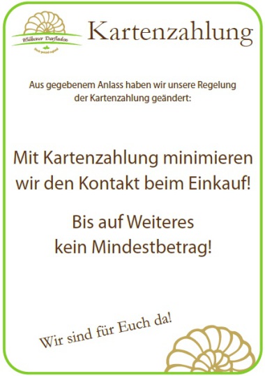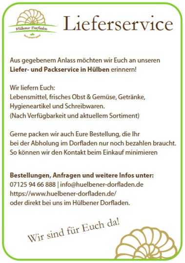 Nutzen Sie das folgende Bestellformular und lassen Sie sich in diesen Zeiten Ihren Einkauf direkt ins Haus liefern. Die Ware können Sie in untenstehender Galerie anschauen, somit sparen Sie sich den Gang in den Hülbener Dorfladen.